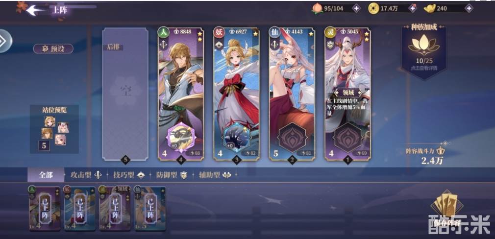 随着抽卡的增多,会有更多的同族的金色灵将(注意:一定不要急于选择启程灵将,后续根据抽到的金色灵将的偏向再选择对应种族启程),此时我们需要慢慢将5人阵容慢慢向同族(或夹杂灵族)靠拢来吃满种族技加成,此时分成三个方向: