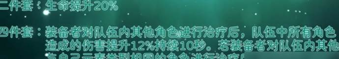 2:四件套效果是,装备者对队伍中其他角色进行治疗之后,队伍中所有角色造成的伤害提升百分之十二,持续十秒,如果装备此圣遗物的人,对于队伍中其他和自己元素类型相同的角色进行治疗之后,可以将队伍中所有角色的元素精通,提升八十点,持续十秒。