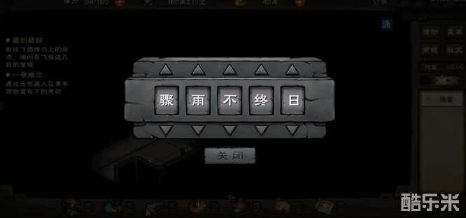 2、进入地室后的第一关是古诗锁,地室(26,25)点击“观察”,看到古诗上阕是“飘风不终朝”,点击(26,24)的石门选择“开锁”,答案是“骤雨不终日”,转动到正确答案就可以打开石门进入下一关的内室;