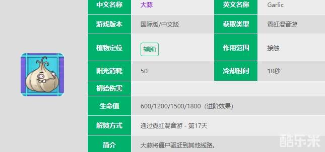 1.大蒜(Garlic)是《植物大战僵尸2》中的防御性植物,不仅可以吸收伤害,任何咬他的僵尸还会被转移到不同的线路。