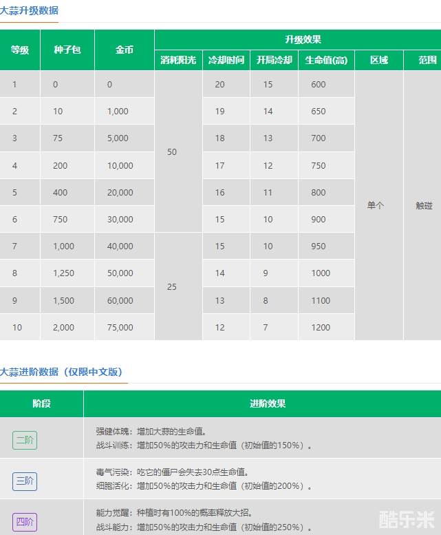 2.大蒜有400点生命值,会在少于266、133时改变外观,不同殭尸对大蒜造成的伤害不同。