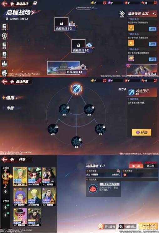 -船长可消耗门票参与活动闯关,上阵两队伙伴挑战据点关卡。通关后船长们可获取不同类型的「集结战场养成币」,养成币可用于升级伙伴在玩法内的战力以及解锁新伙伴。