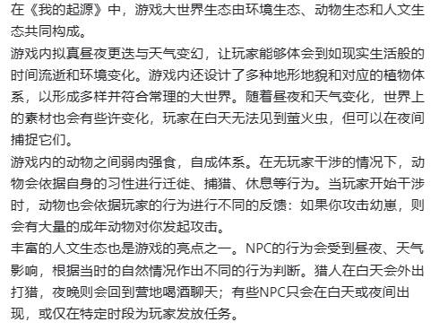 今天我们看的这款游戏便是在去年关服下线的《我的起源》,游戏为沉浸式沙盒“拟真生态”MMO游戏。游戏由完美世界开发,腾讯代理,在2019年的时候沙盒式的MMO手游也算是比较有创意的产品,游戏的宣传中也提到了游戏丰富的自然交互系统。