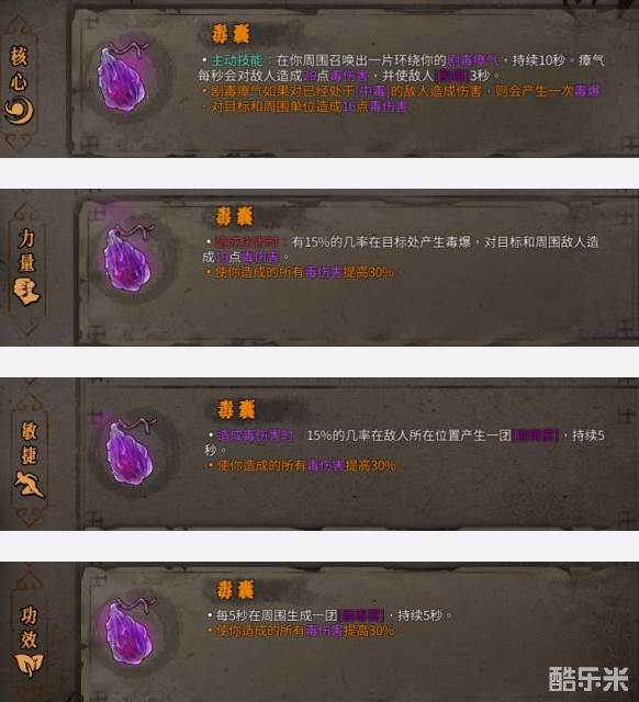 ②仅橙色品质:剧毒瘴气如果对已经处于[中毒]的敌人造成伤害,则会产生一次毒爆,对目标和周围单位造成X点毒伤害。
