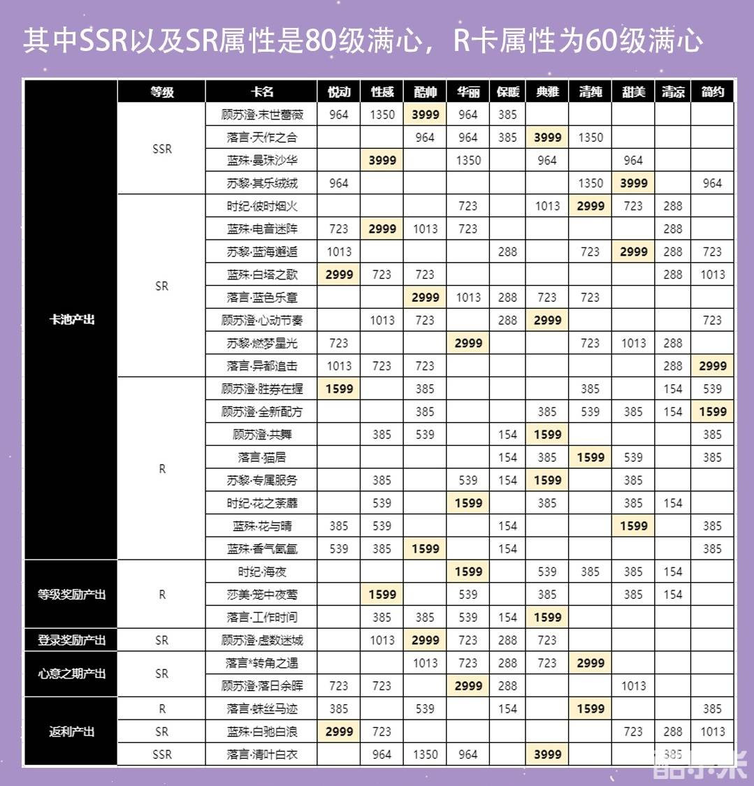 这里列举了目前的卡牌的属性,其中最高的属性用颜色标注出来了,“保暖”“清凉”属性基本可以忽略(普遍低)。