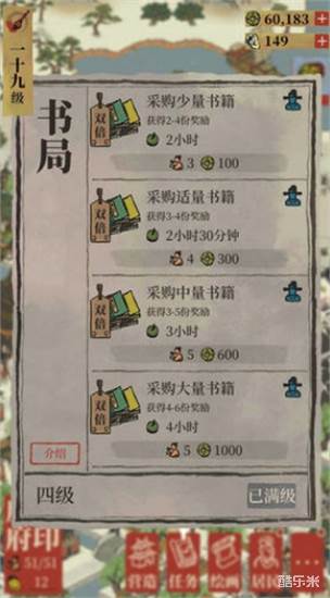 2、书局挂机获得的书籍是有随机性的,而且最高级的书局,满4个小时后,也只能获得4-6份的奖励,小伙伴们需要合理的进行资源的使用!