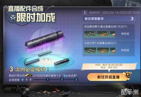2月16日至3月16日,每晚1830至2030幸存者们可以在快乐101直播合成配件。进行一定次数内直播,享受必定成功的buff加成!其他幸存者也可以进行观看、打赏与评论,打赏的金条可优先减免合成消耗!接受一定数额打赏金条后可获得额外必成机会!