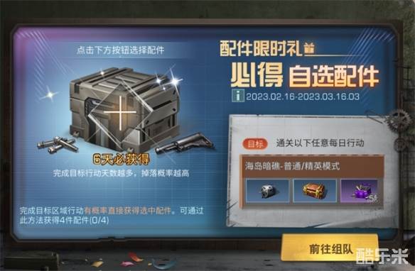 2月16日至3月16日,联盟为提升幸存者的生存能力,特推出自选配件活动!幸存者们可以选择自己需要的配件,共计4枚。每天完成联盟指定的目标区域行动时,有概率必定获得自己的选择的配件!连续六天完成每日行动,幸存者们就可以获得指定配件!