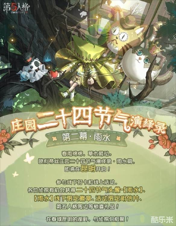 天将化雨舒清景,萌动生机待绿田。网易首款1V4非对称竞技手游《第五人格》庄园二十四节气演绎录第二幕·雨水即将如约而至,让我们相聚春城,共迎鸿雁南归,草木萌动,烟柳满翠湖!
