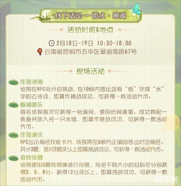 2月18日至19日10:30至18:30,玩家们自行前往翠湖公园内文津桥前的《第五人格》线下活动区域即可参与现场活动,完成挑战,即有机会获得二十四节气头像-雨水、雨水线下限定徽章、线下活动限定明信片和第五人格周边等精美道具和周边!