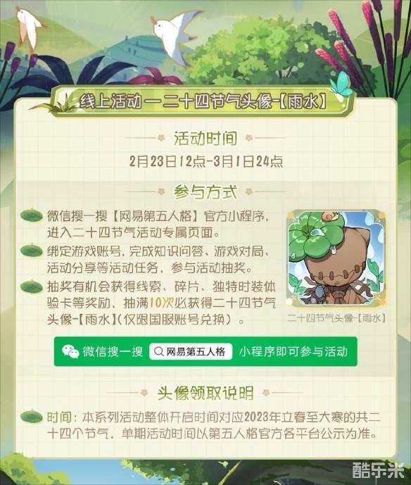 2月23日12点至3月1日24点,玩家们在微信搜索“网易第五人格”官方小程序,进入二十四节气活动专属页面,绑定游戏账号后完成知识问答、游戏对决、活动分享等任务,参与活动抽奖便能获得线索、碎片、独特时装体验卡等奖励,抽满十次则必得二十四节气头像-雨水,与爱哭鬼一起,接受春雨的盈润!