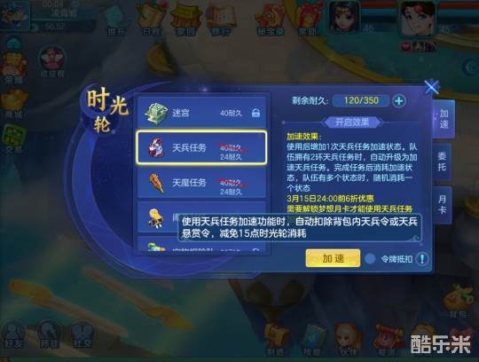 2)天兵天魔加速需要消耗40点时光轮耐久,可使用多余的令牌抵扣部分耐久,外放首月享6折优惠;