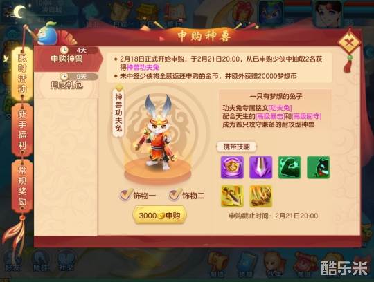 限新服“潜龙在渊”开启,2月18日起可花费3000金币申购神兽,2月21日晚20:00从已申购的少侠中抽取2名获得“神兽功夫兔”,未中签的玩家将全额返还金币并额外获赠少量梦想币。
