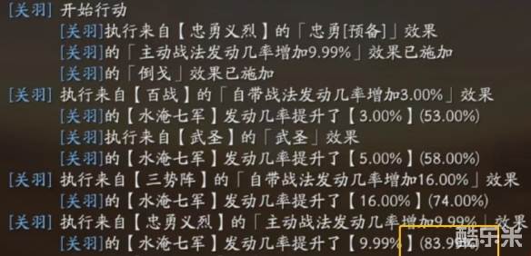 通过堆发动率来保证稳定,二保一来拖回合数,为SP关羽创造输出机会。如果想要爆发伤害,SP关羽的主战法“水淹七军”得发动到4次以上,如果要追求发动次数,一方面要拖回合数,另一方面还要堆发动率(兵书选百战+3%发动率,武圣刀+5%,三势阵加16%,全武1红关羽发动忠勇增加9.99%,总计84%)。虽然概率不到100%,但都堆到84%这么高了,8回合发动4次,这不过分吧