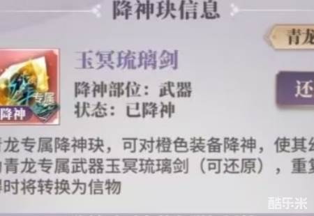 1、专属降神块,可对橙色装备降神,使其幻化为对应角色的专属武器(可还原),重复获得时将转换为信物。