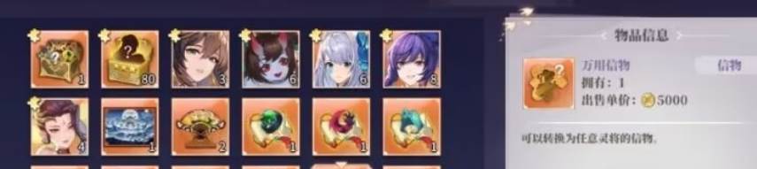 一个万用信物卖五千铜钱,不过大家千万不要出售,不然真的亏死。要注意的是点击使用后我们就会弹到灵将录界面,不要轻易点击灵将直接使用,万用信物获取较为困难,有很多需要我们氪金才能获取,所以不建议大家轻易使用,用到后期红色灵将身上更有效果。