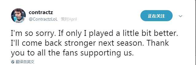 真的非常抱歉。如果我能打得再好一点就好了。下个赛季我们一定会更加强大。谢谢所有支持我们的粉丝。