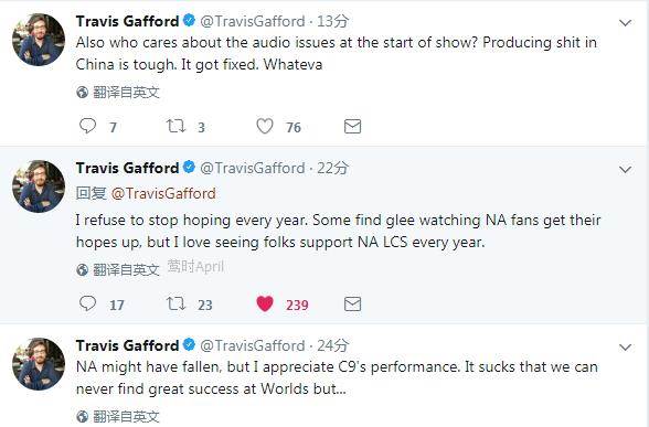 北美也许倒下了,但我很欣赏C9的表现。我们一直没能在世界赛取得好成绩,的确是糟透了。但是,我每一年拒绝放弃希望。有些人看到北美粉丝充满希望,会幸灾乐祸,但我却爱看到每一年北美联赛依然有那么多人支持。还有就是,谁在乎比赛前的音频事故?想为难中国真的太难了,故障还是解决了,不想那么多了。