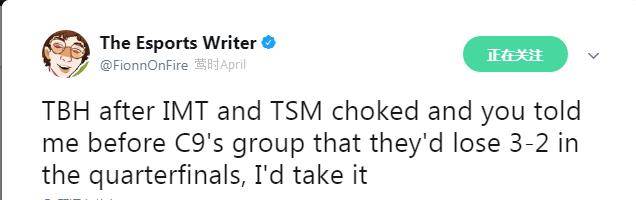 “说实话,在IMT和TSM都不灵光的时候,你在C9的这场八强赛前告诉我,他们会以2-3输掉比赛,我完全可以接受。”