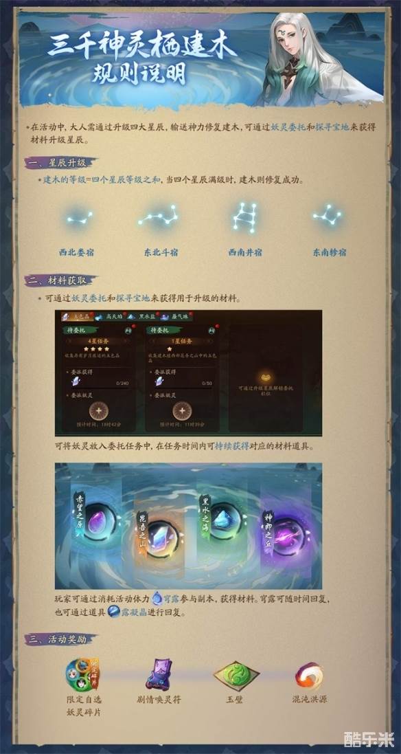 为了探索建木之中的秘密,降妖师大人需要通过妖灵委托和探寻宝地,搜集珍贵的四种材料以升级四大星辰。星辰之力汇聚为神力后输送至建木,便可将其缓慢修复,从而打通前行的道路。当建木修复完成之时,降妖师大人便可获得获得包括限定妖灵碎片、混沌洪源和剧情唤灵符在内的稀有道具奖励。