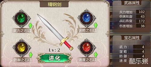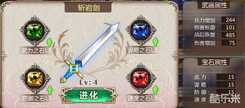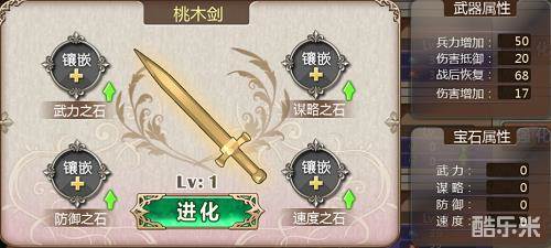 当武器镶嵌买四种属性宝石之后,可以提升武器等级。升级之后将消耗所有宝石(属性不变),之后可镶嵌对应武器等级的宝石。