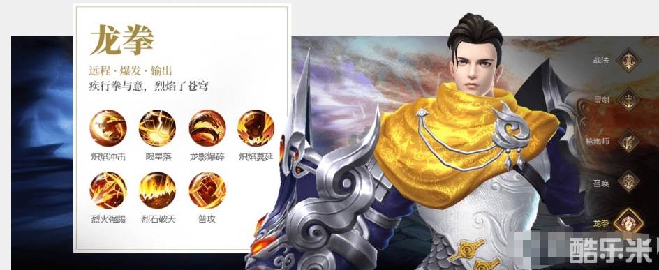 二、龙拳,疾行拳与意,烈焰了苍穹!以威武的臂铠为武器,能释放拳风进行远程范围攻击,并且突进攻击敌人,热血之拳开天辟地。披上红莲的如火身姿,招式似熔岩迸发,可以对多个敌人造成猛烈的伤害。万物震荡,大地焦灼以幻影进行来回穿梭攻击,顷刻间只凭力拔山河的气势足矣撼动人心。