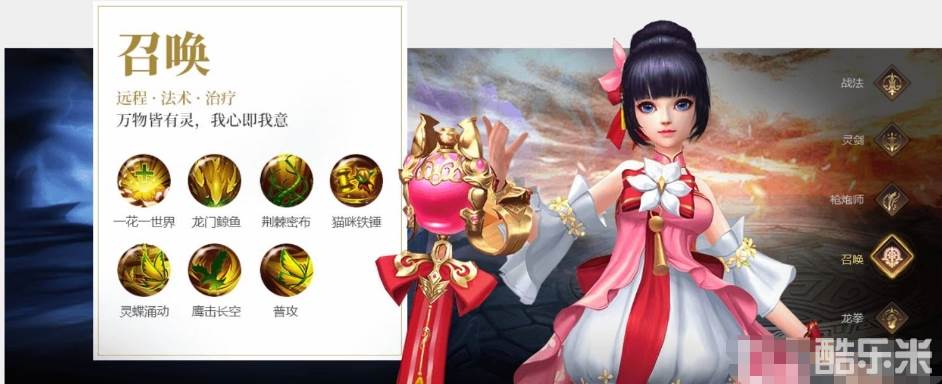 三、召唤,以法绫为武器,集可爱与支援并存的职业,操作简单容易上手。巧用自然之力,进可攻退可守。无论是团队输出,还是功能辅助,都是绝对重要的存在,召唤兽作为召唤师的亲密伙伴,伤害不俗还能利用花阵治疗。召唤师技能以远程、法术、治疗为主,尤其擅长荆棘密布、一花一世界技能,对范围内进行控场恢复友方状态。