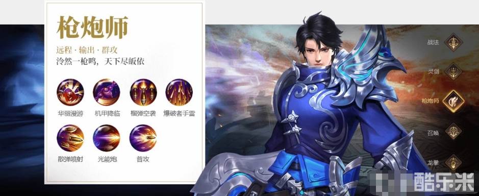 五、枪炮,以重炮为武器,集帅气与火力并存的控场职业,需要一定的操作基础。枪林弹雨摧枯拉朽,随时力挽狂澜,让战场瞬息万变。枪炮就像是移动的炮台一样,震撼一切世界,拥有密集的火力压制,同时也能遁入隐身,创造绝杀可能。枪炮师技能以远程、输出、群攻为主,尤其擅长机甲降临、华丽漫游技能,对范围内造成绝对的压制伤害。