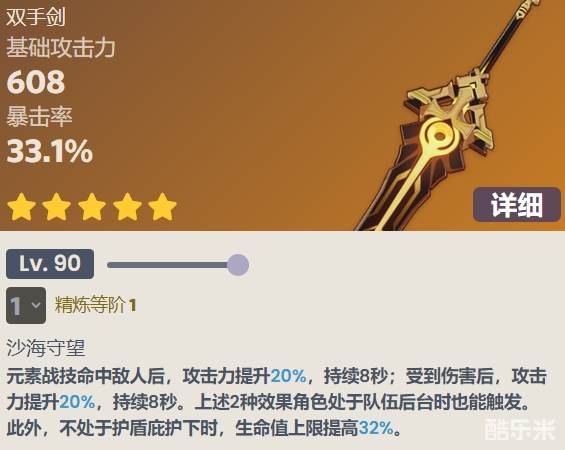 元素战技命中敌人后,攻击力提升20%,持续8秒;受到伤害后,攻击力提升20%,持续8秒。上述2种效果角色处于队伍后台时也能触发。此外,不处于护盾庇护下时,生命值上限提高32%。