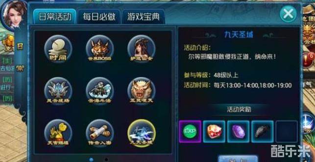 温馨提示:在九天圣域内,非组队玩家可以互相攻击的,所以在认真做任务的时候,一定要小心其他玩家的进攻。活动内的所有任务和奖励,会在次日0:00准时清空,亲爱的各位玩家,请记得及早参与活动。