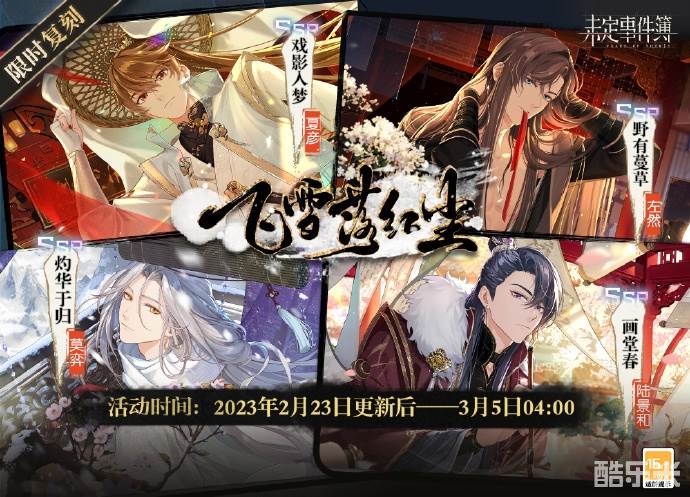 3.1版本更新后,「飞雪落红尘」DLC上架「事件簿-活动-往期」。完成任务即可获得【记忆星石】及【未名晶片】奖励;「飞雪落红尘」活动复刻女神之影同步上线,夏彦SSR【戏影入梦】、左然SSR【野有蔓草】、莫弈SSR【灼华于归】、陆景和SSR【画堂春】获得概率提升。
