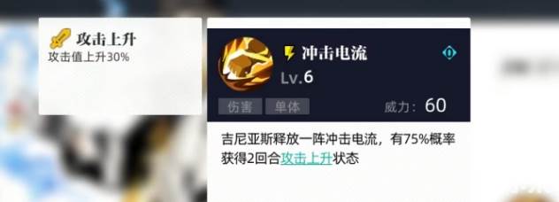 第1个技能冲击电流,使用电流攻击敌方单体目标,有很高的几率使自身获得攻击上升状态,在此状态下自身攻击值提高30%,在提升状态下自身输出能力就被拉到四星角色水准。第2个技能震荡电流,开启技能之后拿出战斗仪扫描敌方选定目标,能够快速找到弱点。在攻击之后有几率为其附加防御下降状态,对此状态影响目标防御值下降达到50%,这已经是非常恐怖的削弱。