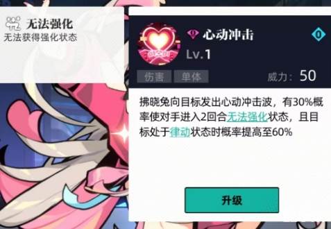 拂晓兔作为一名四星角色,外观非常迷人可爱,所以拥有不少粉丝,自身三个技能也很有特点。第一个单体伤害技能心动冲击,向对方发动冲击波之后,除了伤害之外还有几率使对方进入到无法强化状态,因为在该游戏战斗过程中很多技能都会附加各种各样强化状态,例如速度提升,攻击提升或其他类型。一旦无法强化,战斗力下降很快,并且此技能还将对处于律动状态目标有额外几率加成,律动是拂晓兔专属效果。由第2个技能闪亮登场附加。