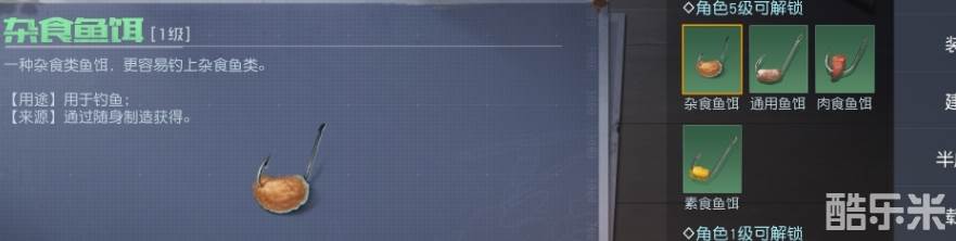 初入游戏是无法钓鱼的,必须到达一定等级之后解锁身份与相应玩法。而想要钓鱼有两样东西肯定是少不了,首先是鱼竿再就是鱼饵。这些通过随身制作便能获得。目前鱼饵有四种,分别是【杂食鱼饵】、【通用鱼饵】、【肉食鱼饵】、【素食鱼饵】,制作所需的材料基本也都是大家日常采集的一些肉类、浆果、菜之类的。制作好鱼饵之后,然后就是鱼竿,这个需要500木材和4块铁矿石,值得注意的是这里的铁矿石直接采集下来的是不能用的,必须是要经过庄园原材料加工台加工的才可以用。有了这些材料就可以随身制作鱼竿了。