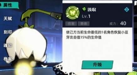 首先是普通技能是使用自己方生命值最低的一个队友获得小豆芽生命百分之十五的恢复当然这还只是一级的效果,数值是会随着技能提升不断变高的,所以小豆芽的属性还是需要增加血量才能保障奶量充足。