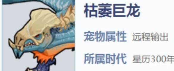 在这个游戏中,宠物主要分成四个不同的种类,其中有远程输出,近战输出和近战坦克以及治疗辅助,这四个不同的位置有着不同的技能效果,首先在远程输出中最推荐大家去使用的一个宠物名为枯萎巨龙,它在外观上是一个蓝色巨大的龙,头顶还带着一个骷髅,看起来就非常的厉害。它的属性是远程输出攻击是毒元素以及对敌人造成挥砍伤害,大家要想获得这个宠物的话,需要去星历300年在那里进行捕捉。它在游戏中可以跟着远程攻击的主人,然后在距离敌人比较远的距离并攻击敌人,对敌人造成比较高的伤害,而且z韩国宠物在后期的话,经过玩家的培养还能得到很大程度的提升,伤害也会更高,因此是比较推荐大家去使用的一个宠物。另外从它的介绍中能看出来,它非常的厉害,看过它的人都没有离开过那个地方,是游戏中多位冒险者最喜欢的一个远程输出宠物。