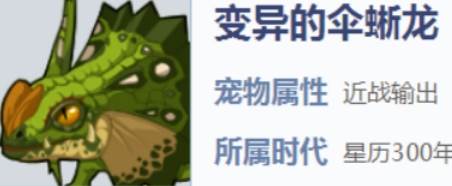 它是一个非常厉害的近战输出类宠物,在外观上就是一个蜥蜴的样子,它的脖子呈现一个伞状,所以又被称为变异的伞蜥龙,所处的时代是星历300年,它可以在距离敌人很近的时候,并对其造成穿透伤害,它是一个非常灵活的捕猎者,特别善于与猎物进行周旋,有着超高的移动速度,可以快速击杀敌人,是一个非常可靠的近战宠物,非常适合培养,让大家要注意的是他比较害怕冰元素穿透伤害,若是对战的是冰属性的宠物的话,不推荐使用它哦。