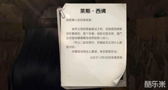 2、解谜方法:信件上说四句话二真二假,所以只需要简单推理一下就可以知道遗产属于四弟莱斯·西佛,所以他的生日12月5日就是密码