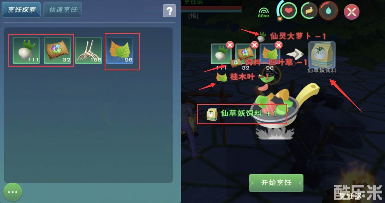 仙草妖饲料=四叶草饲料包+桂木叶+仙灵大萝卜