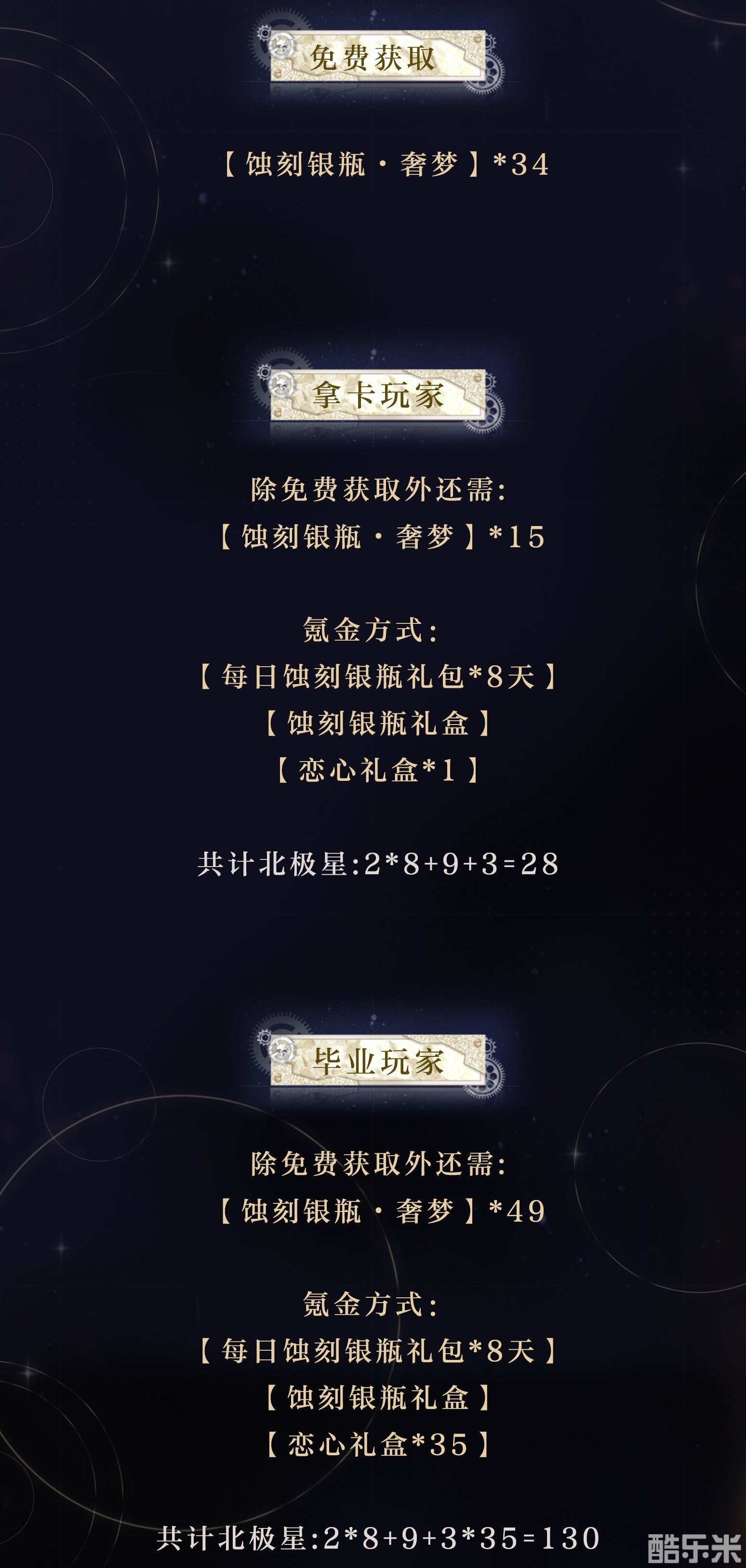 2、只想拿卡的设计师:完成限时任务,每天购买2北极星和9北极星的【蚀刻银瓶】,只需要购买1次3北极星【蚀刻银瓶】即可保底拿卡。