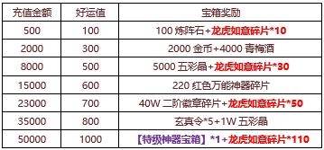 【活动内容】活动期间可通过充值金币获得好运值,积累好运值即可打开宝箱奖励,闪耀称号,全新神器,绝对超值的提升战力资源,尽在特惠好礼。