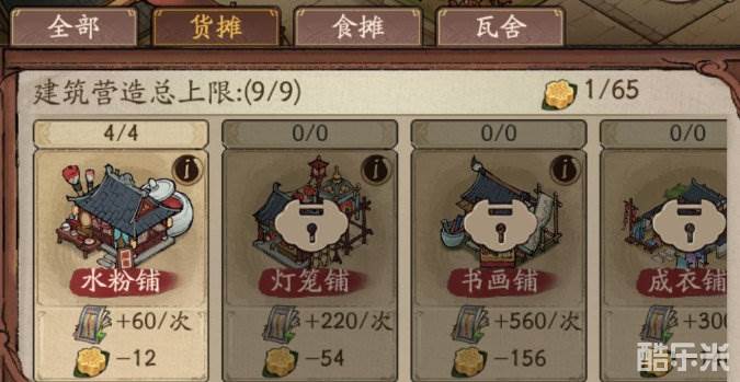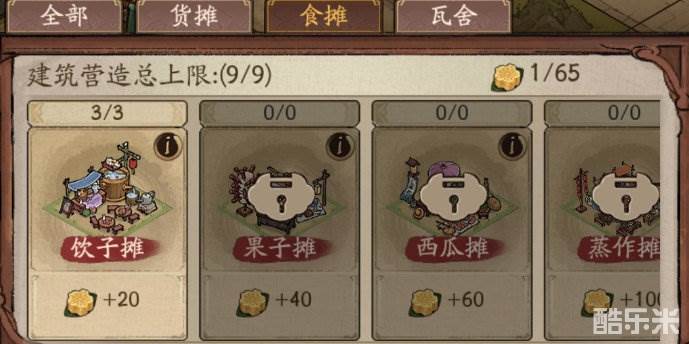 货摊:只能营造在街道两侧空地。营造占用食物,并根据相邻街道格的数量提升交子产出。