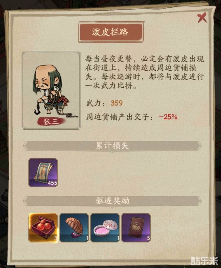 事件一:恶霸泼皮,巡游过程中会随机遇到恶霸泼皮抢占掌柜的经营奖励,快快排除强力街道司解决他们吧。要留意街道司武力同泼皮武力哦~