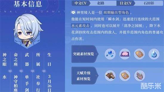从官方发的消息我们可知,神里绫人是一位周期输出型角色,他能在短时间内使用「瞬水剑」迅速进行连续的大范围水元素攻击,同时也可以展开「清净之园囿」,降下水花剑持续攻击范围内的敌人,并提升范围内角色的普通攻击伤害。