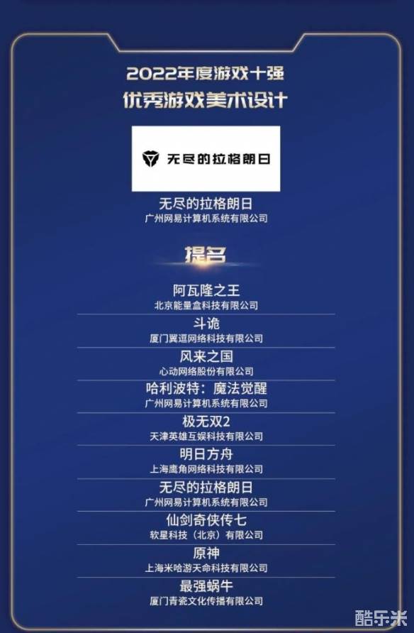中国“游戏十强年度榜”创设于2004年,是国内举办历史最长,竞选游戏数量最多,也最具代表性、影响力和公信力的奖项之一,在我国游戏圈内向来有着“封神榜”的美誉。能够获得提名的游戏,无一例外都是国内游戏行业中的翘楚。本次与《无尽的拉格朗日》一同入围2022“中国游戏十强”榜单的,还包括《原神》、《暗影火炬城》等优秀作品。能够在如此激烈的竞逐中脱颖而出,无疑是对《无尽的拉格朗日》极大的肯定。