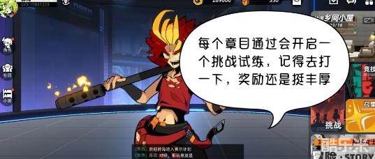 挑战:记住[试炼挑战]+[精英大会],这两个都可以去打一下,[试炼挑战]是角色的养成副本,可以获得升级所需的经验、角色突破材料,角色刻印获取,记得挑战次数可以用[通行证]增加次数,不打就是巨亏;