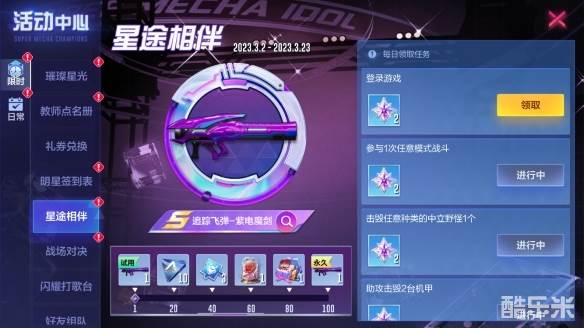 活动期间参与对局完成对应任务,可以领取“追踪飞弹-紫电魔剑”等丰厚奖励!