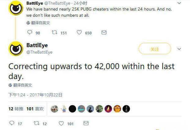 昨日《绝地求生:大逃杀》官方反作弊系统BattlEye发推表示,在过去的24小时内游戏已封禁了2.5万个作弊账号,今日他们再次更新数据,过去一天里,游戏就封禁了4.2万个开挂作弊账号。