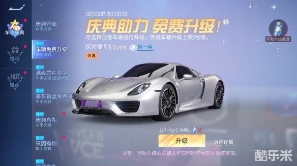 庆典期间,“车辆免费升级”活动将限时开启。车手们完成登录、分享、比赛等任务,便可轻松获得珍贵资源“车手能量”,消耗该道具就有机会让赛车的等级直升!传说级赛车最高可升至8级,史诗级赛车最高可升至9级,稀有和普通赛车更可升至10级,以满级状态,迎接速度挑战!