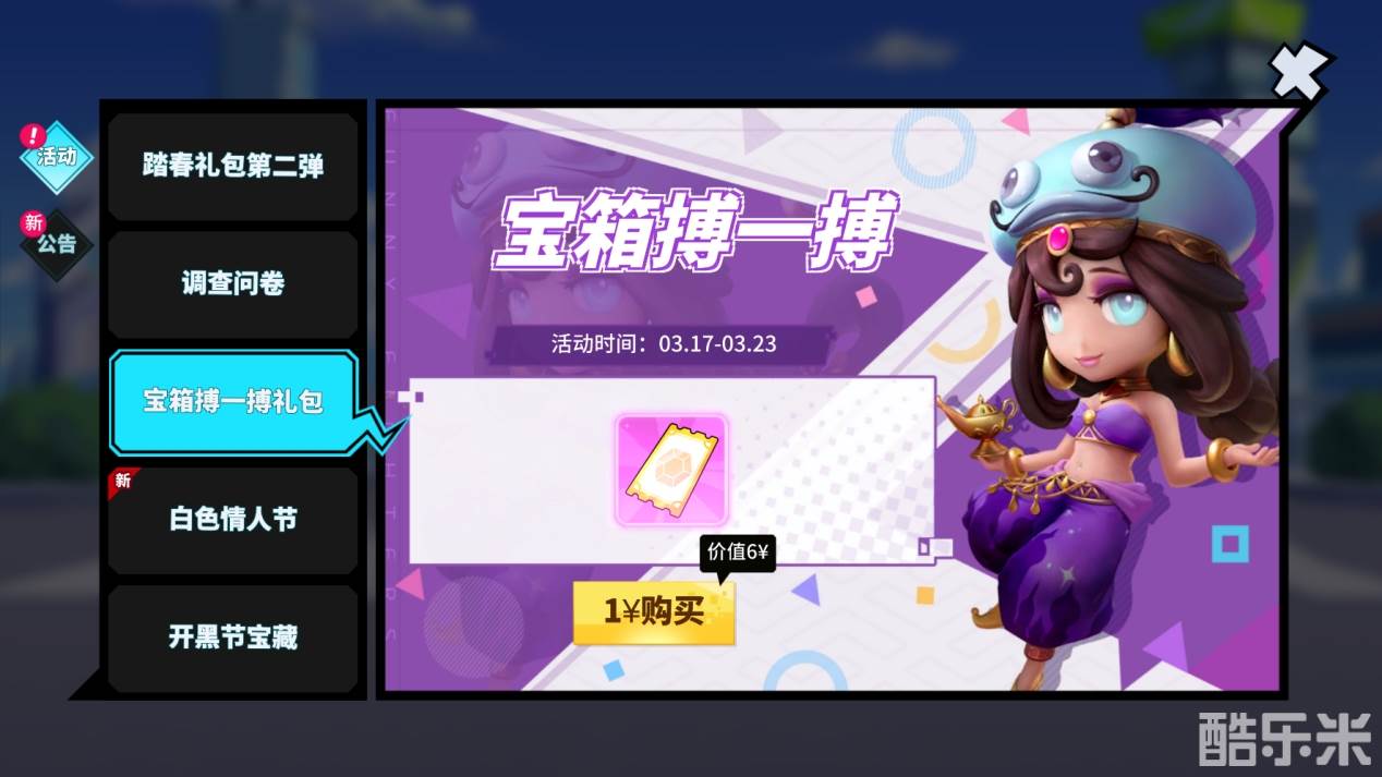 组队进行3次游戏:随机获得以下道具之一:金币300、粒子300、精良宝箱券、史诗宝箱券